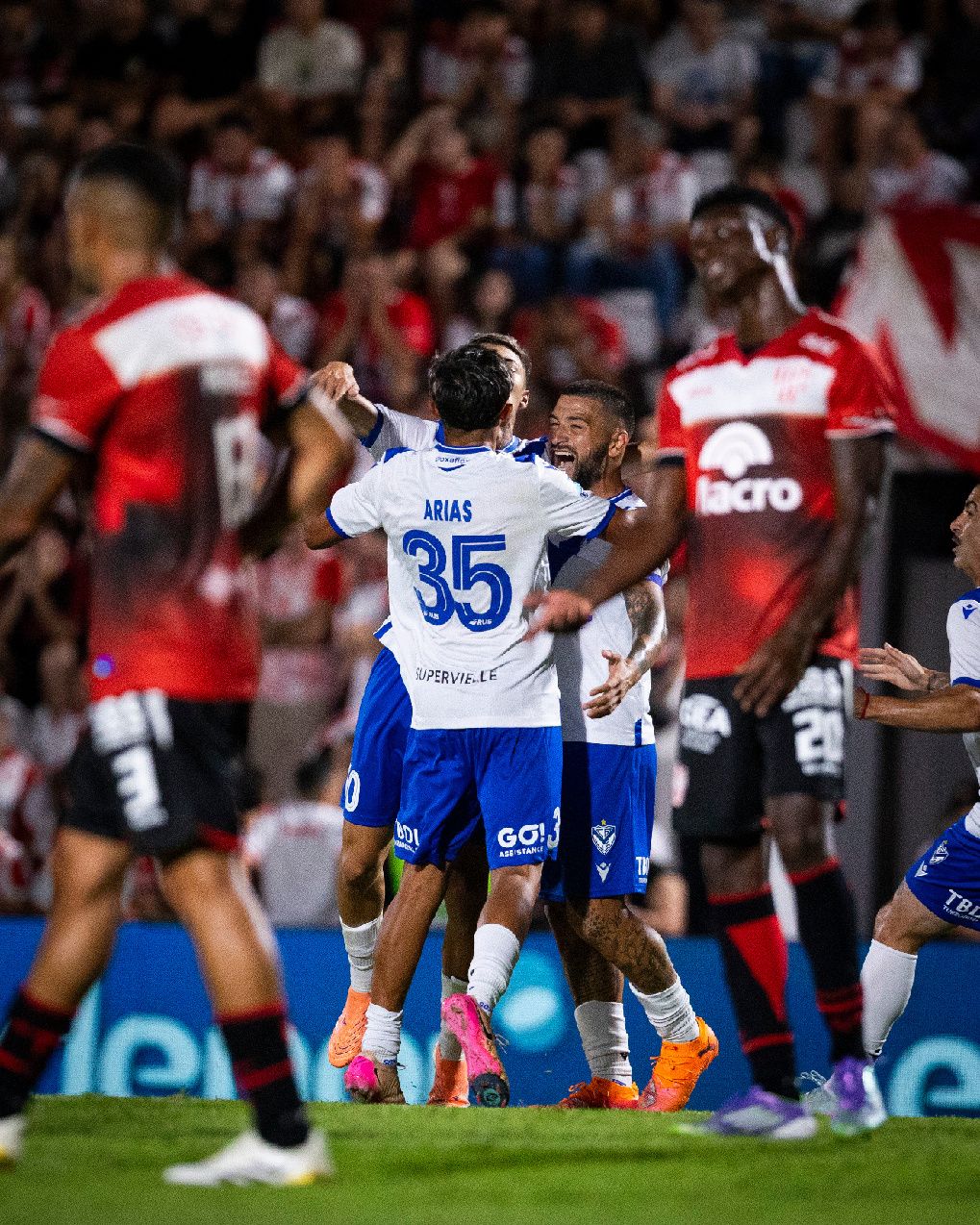 Mati Arias se suma al festejo con Tobías y Elías Gómez. El volante zurdo habilitó a su amigo para darle el triunfo a Vélez. (Foto: Hernán Mauricio)